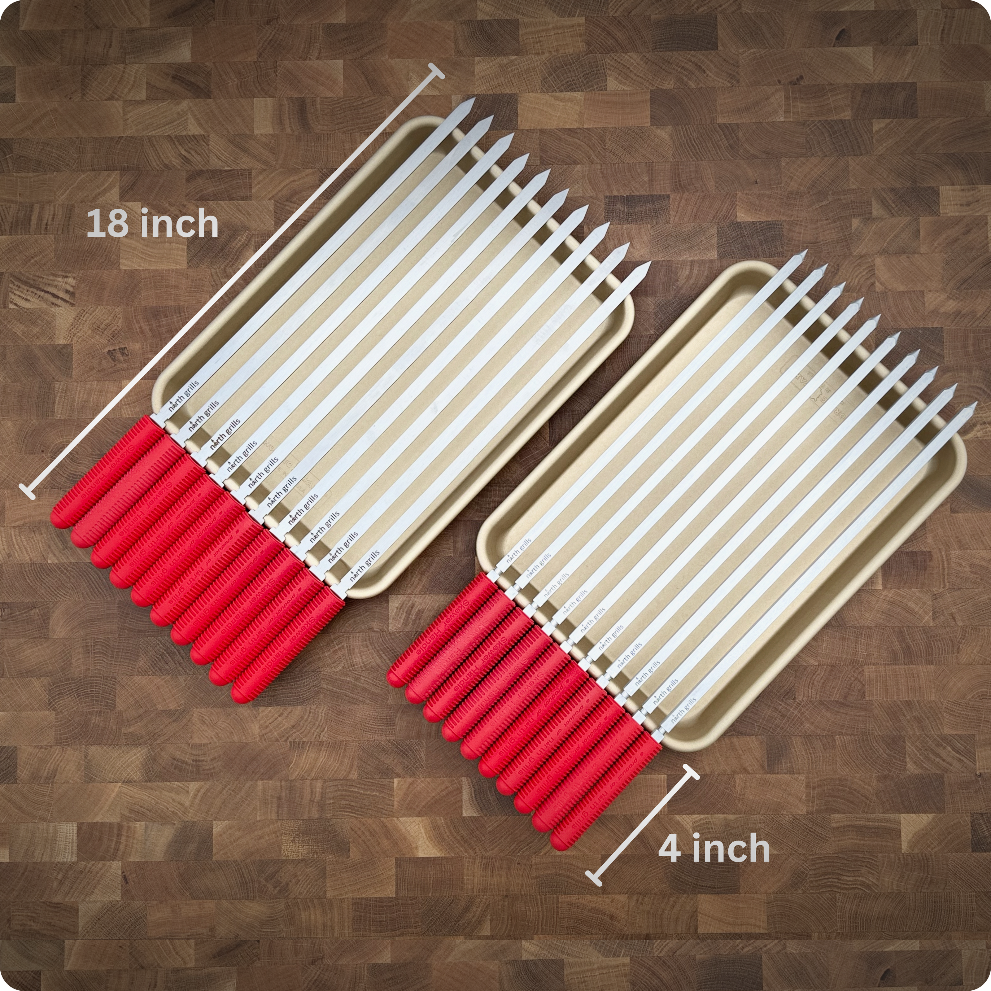Includes 10 square aluminum seekh skewers and 10 flat stainless steel 430 skewers with removable heat‑resistant silicone handles.